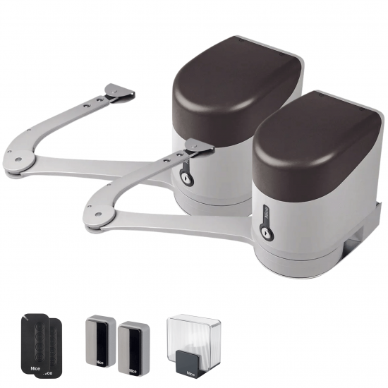 Nice HYKEBDKCE este un kit de automatizare poarta batanta cu brate articulate ideal pentru porţi cu canaturi de până la 3.5 metri si 330 kg, chiar și cu stâlpi mari.